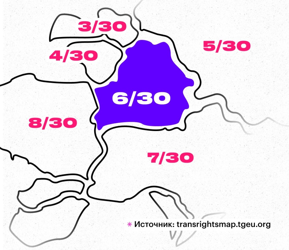 Беларусь набрала только 6 поинтов из возможных 30. Неожиданно, но это больше, чем у соседних Литвы и Латвии: они набрали по 4 и 3 поинта соответственно. Наиболее благоприятная обстановка для трансгендерных людей — в Исландии: 26 поинтов. Хуже всего дела обстоят в Кыргызстане Туркменистане, Таджикистане , Узбекистане и Азербайджане — эти страны не набрали ни одного поинта.